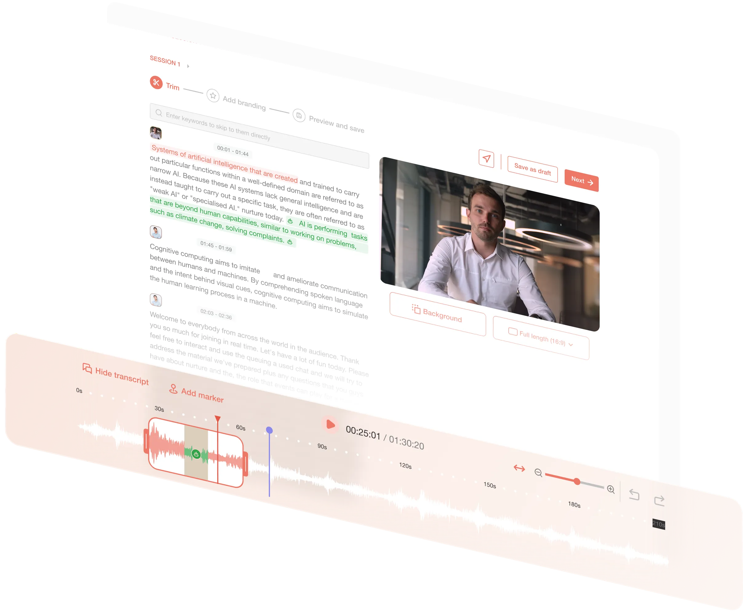 No more watching webinar videos 2-3 times to find sharable video cuts or marketable comments.