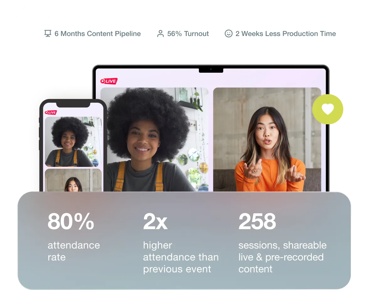 Webinar+ has industry leading engagement features to keep audiences hooked. Create meaningful interactions with live video-interactive polls, Q&A, chats, reactions, and conversion prompts to boost engagement. It’s time to move beyond basic, repetitive webinars to immersive experiences.